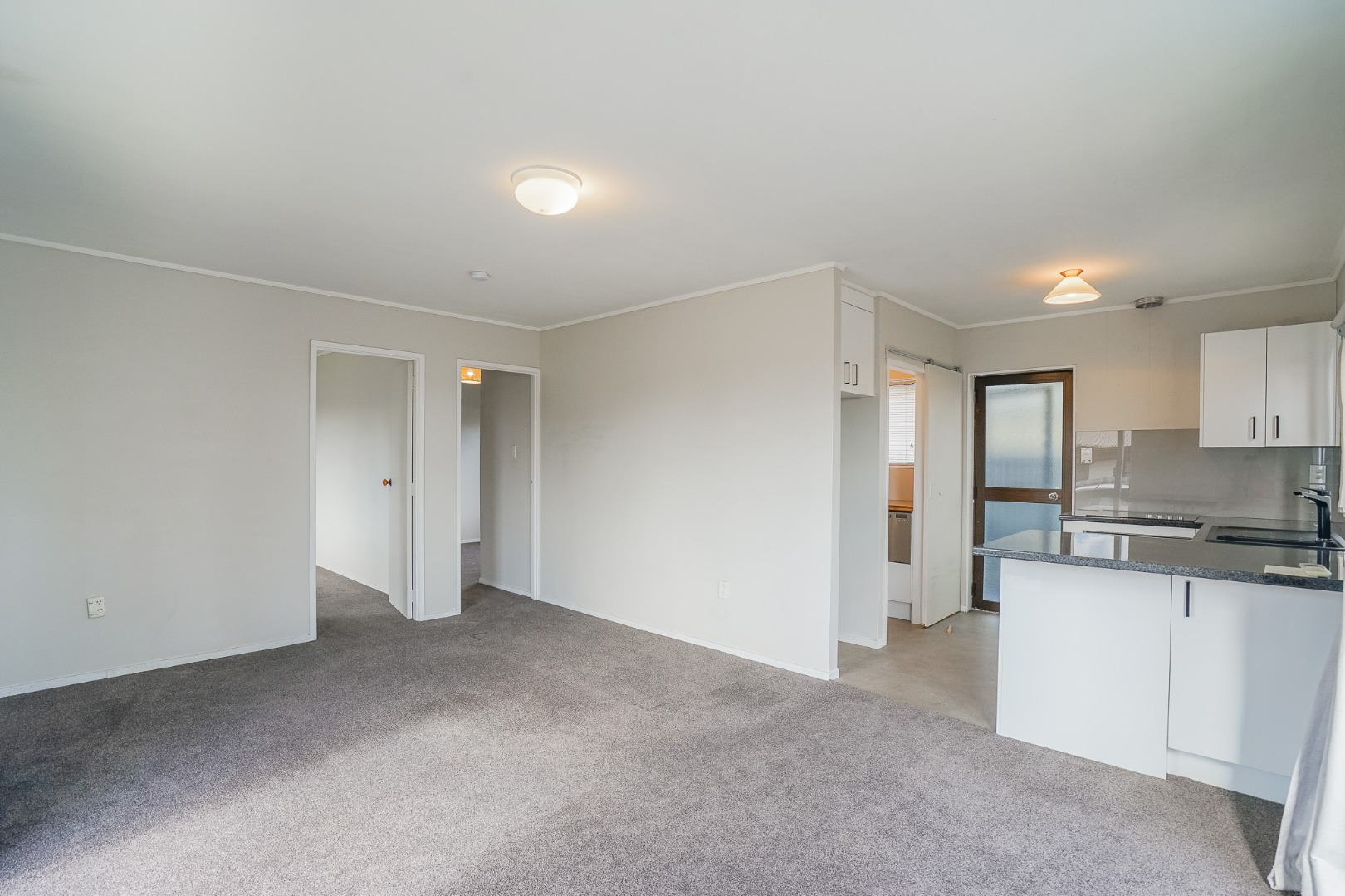 Inside, the home features an open-plan lounge and kitchen area that creates a warm and welcoming living space. Just off the kitchen is a full bathroom, while a back door leads through to the laundry area and out to the washing line for everyday convenience.