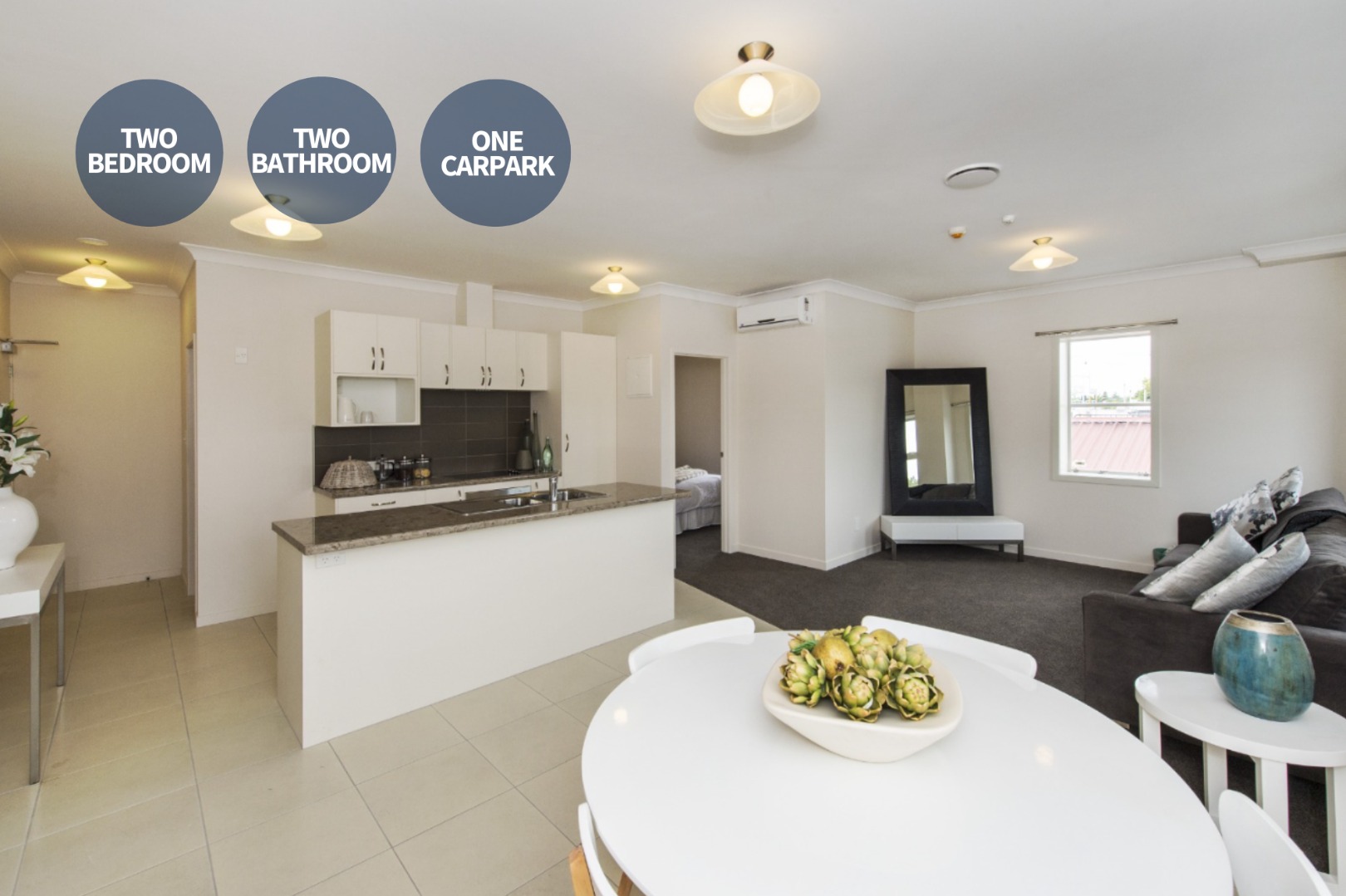- Two bed rooms, two bathrooms and open-plan living
